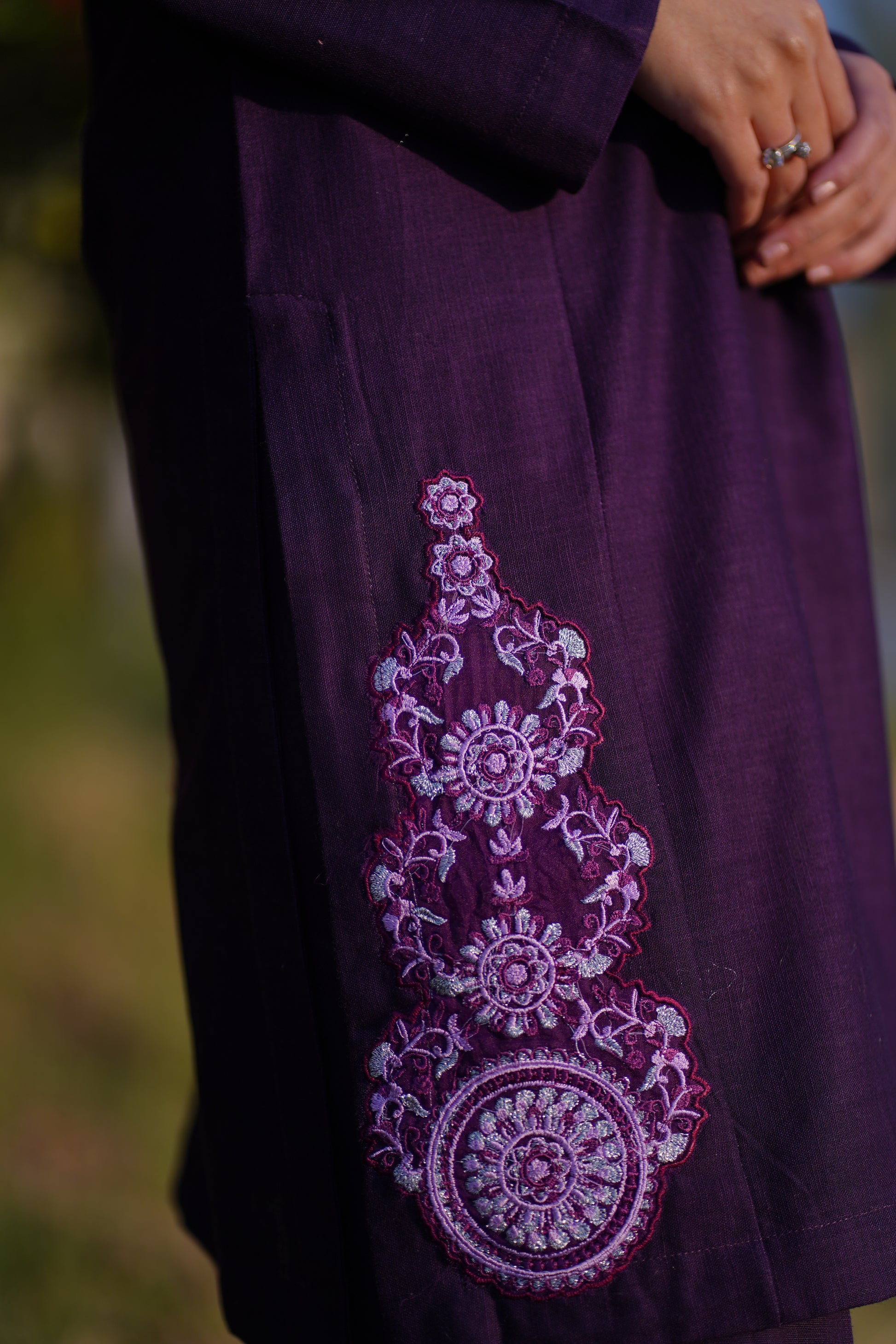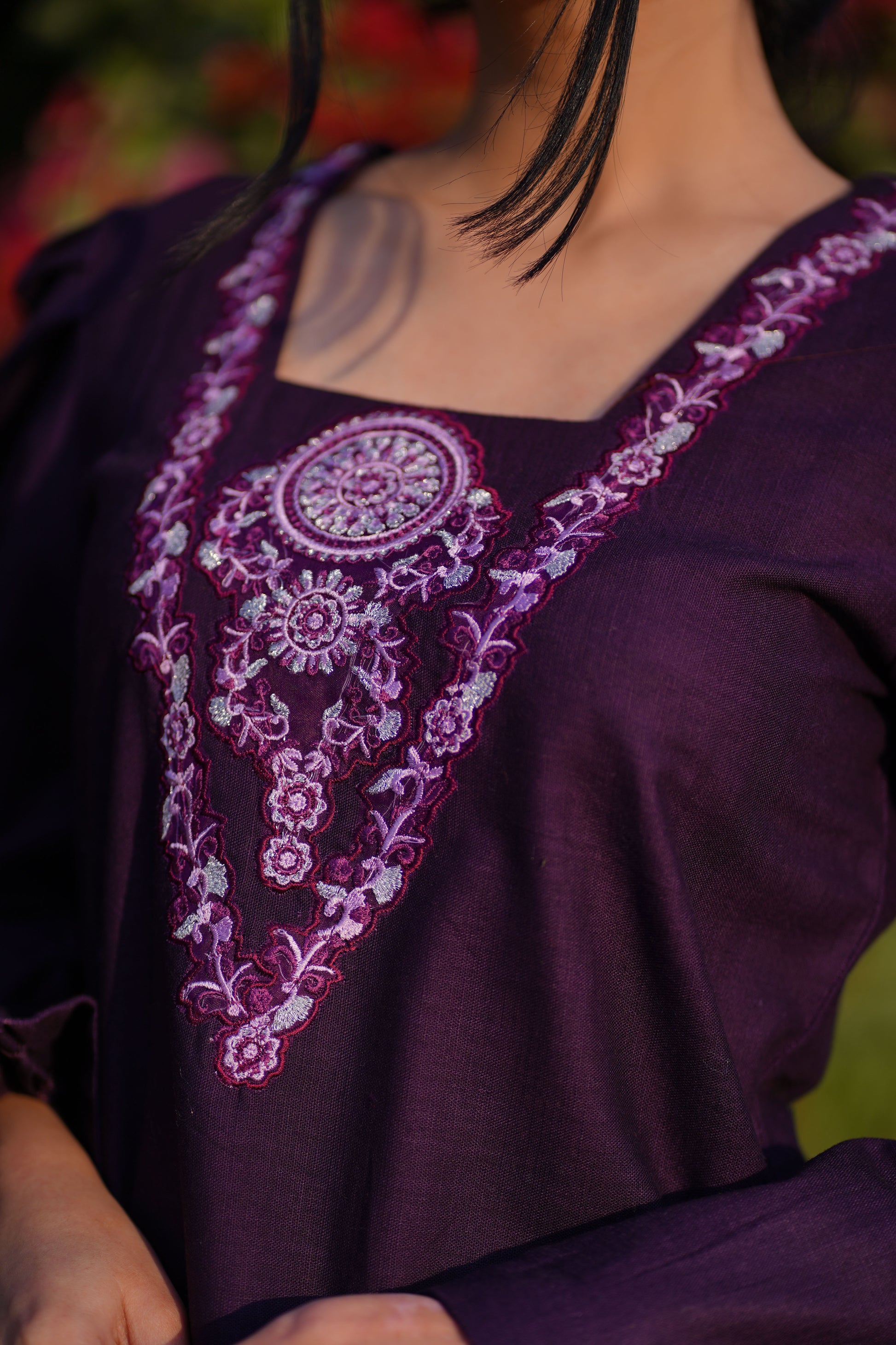 This two-piece dress is crafted with bamboo winter fabric, adorned with stylish daman bunch embroidery and intricate tilla embroidery on the front neckline. The top is complemented by butterfly puffy sleeves, while the straight pants complete the look.