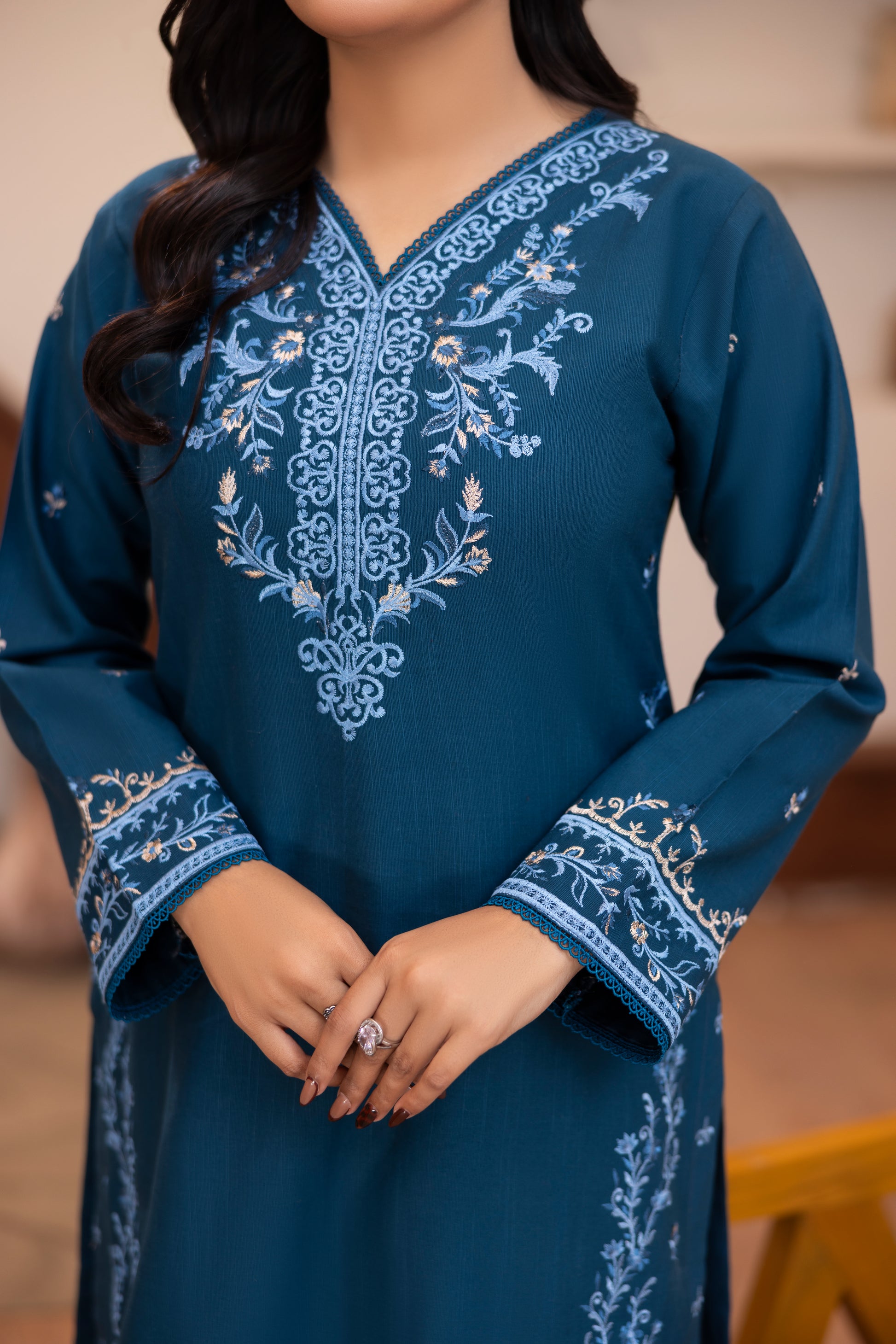 Fabric details: Slub khadar embroidered shirt paired with same trouser.
