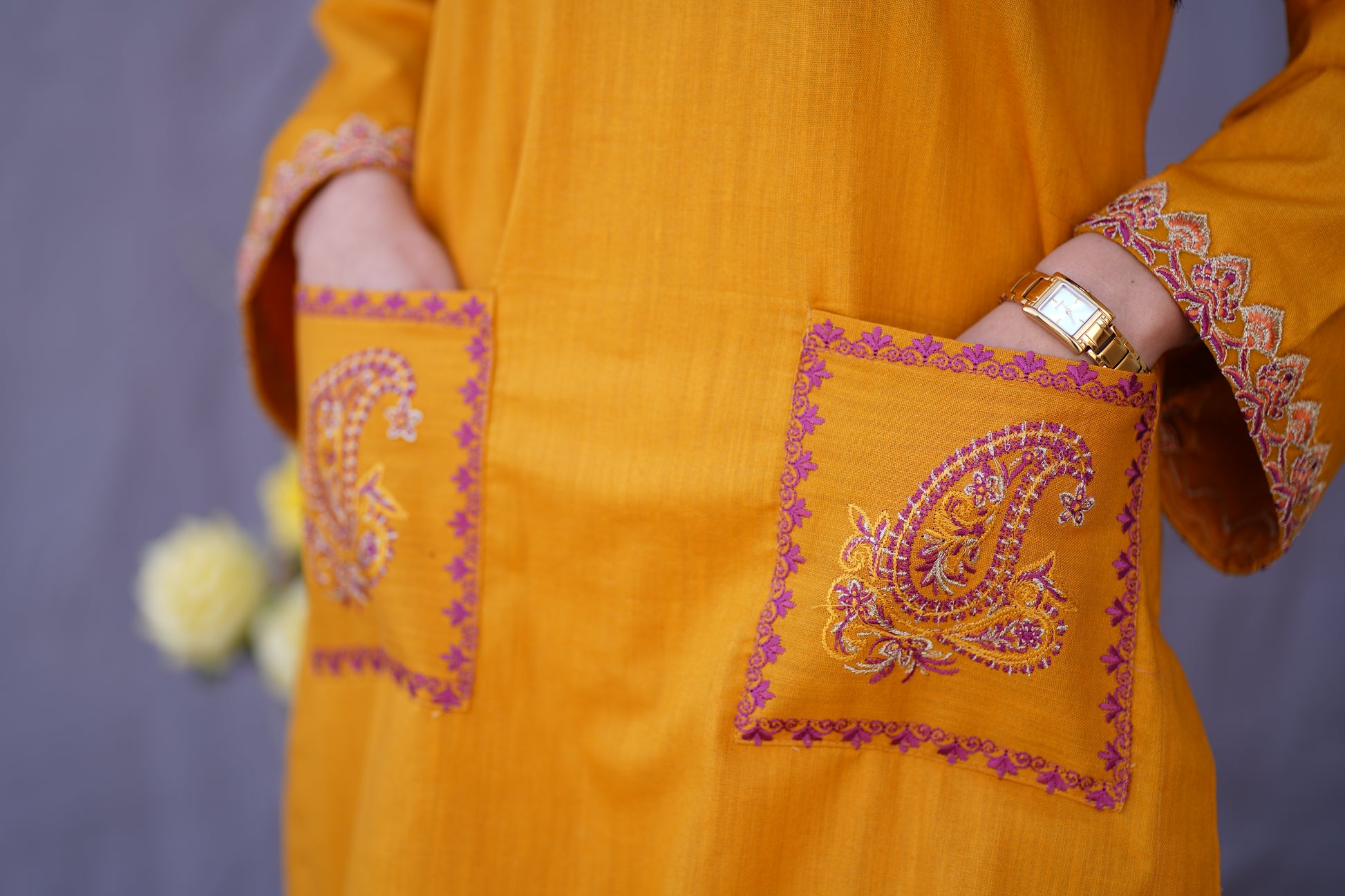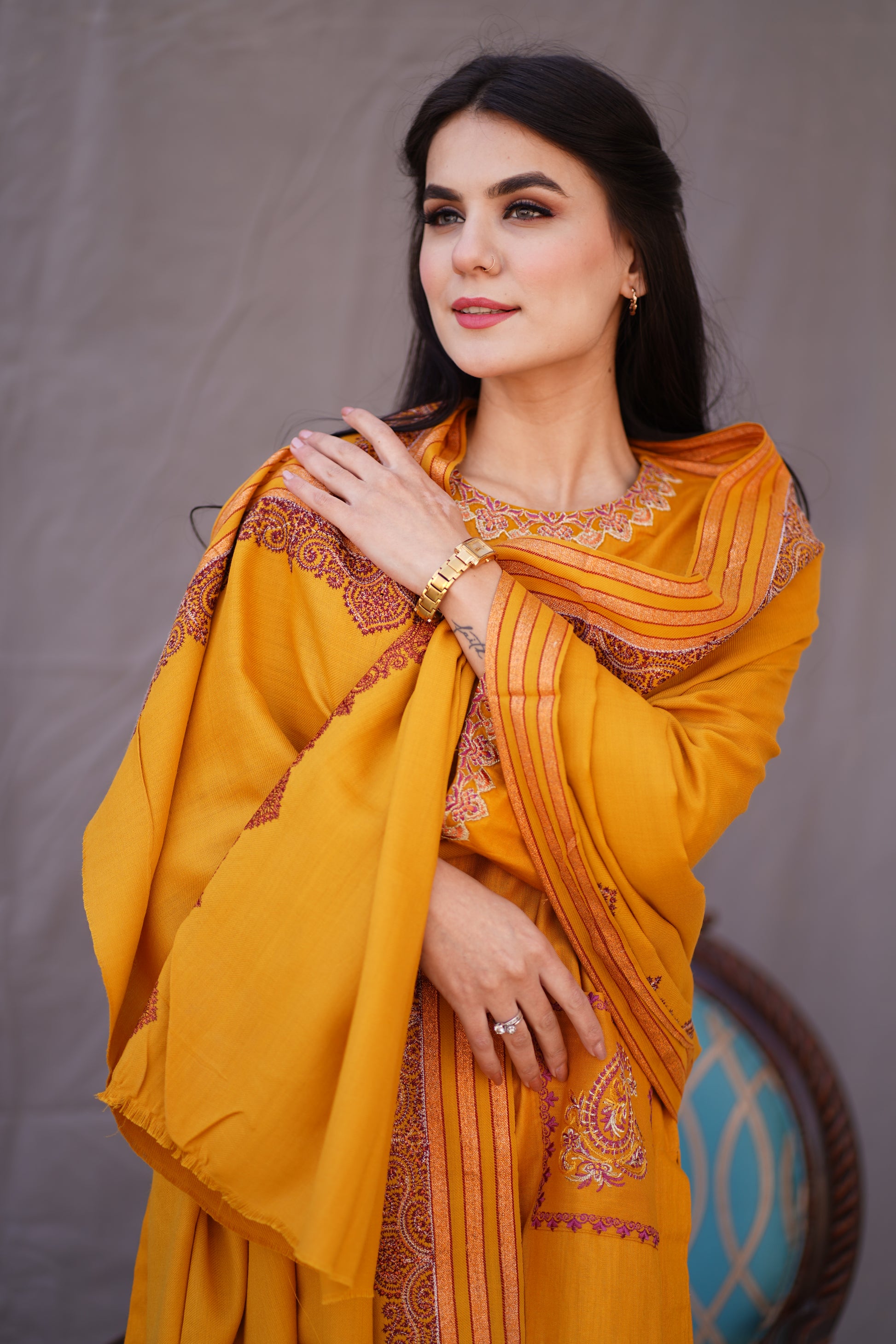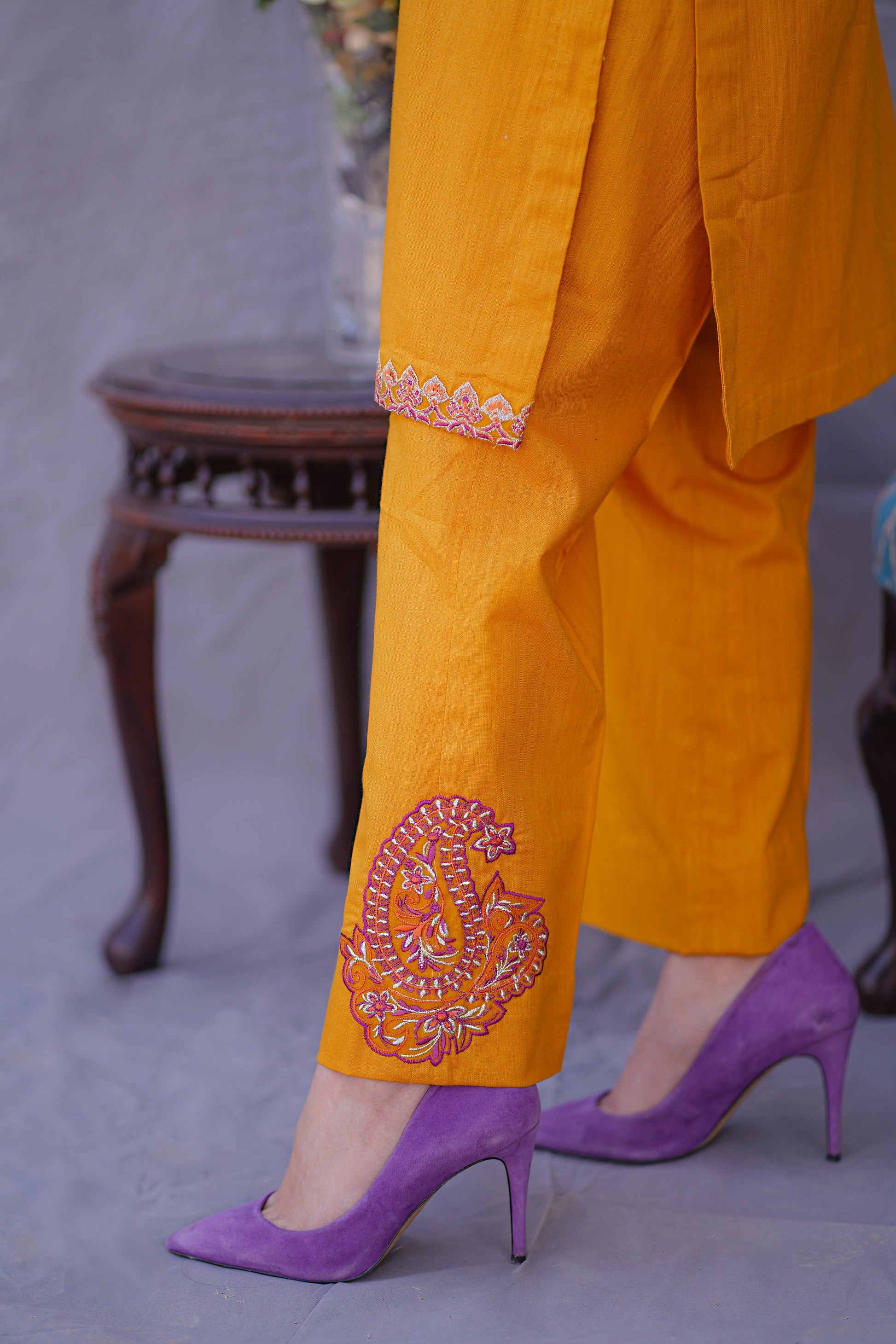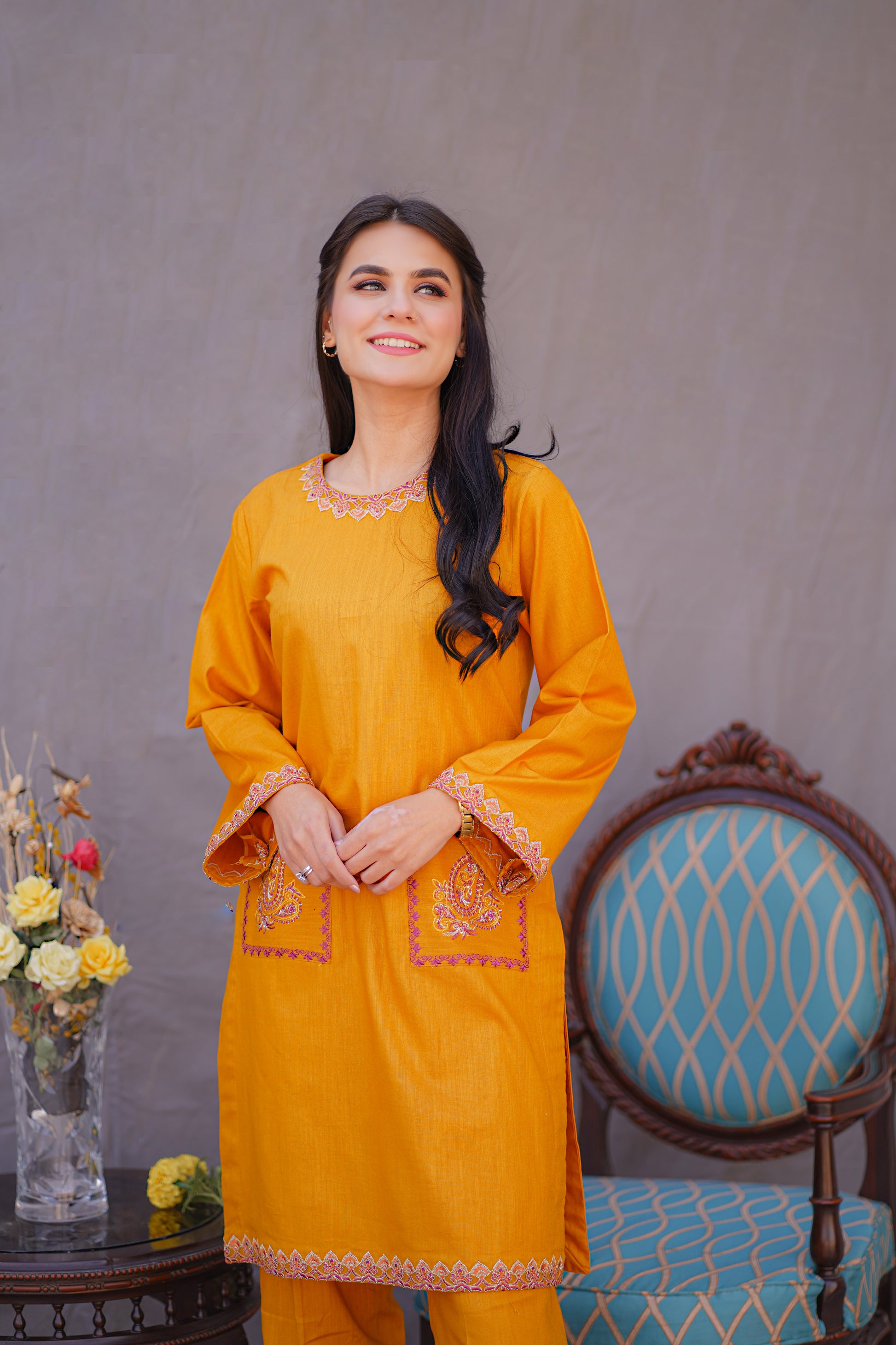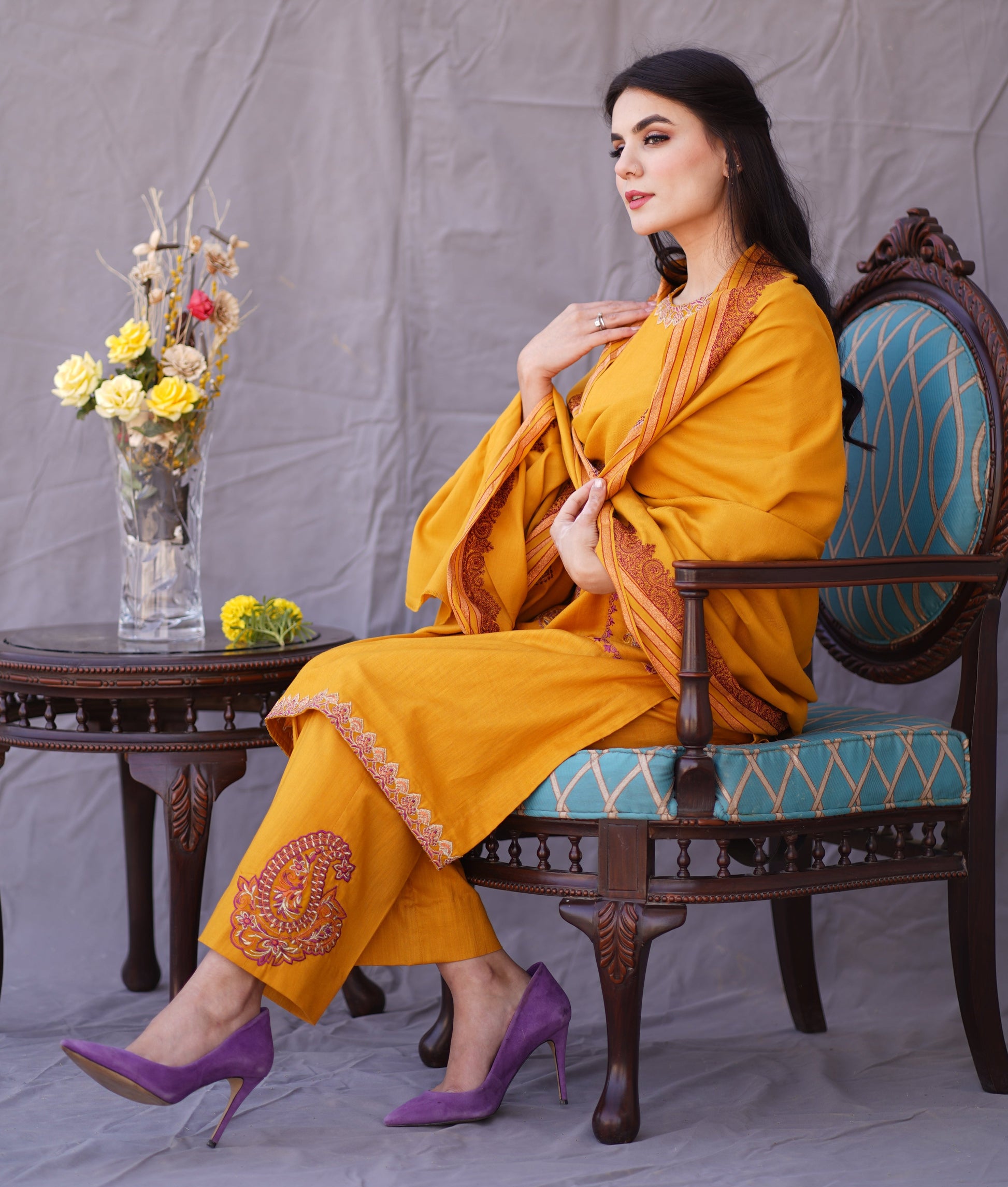 This Mustard bamboo fabric, product features a 3-piece design with applique on the trouser and neckline. It also includes front two pockets and is perfectly complemented by a pashmina shawl.