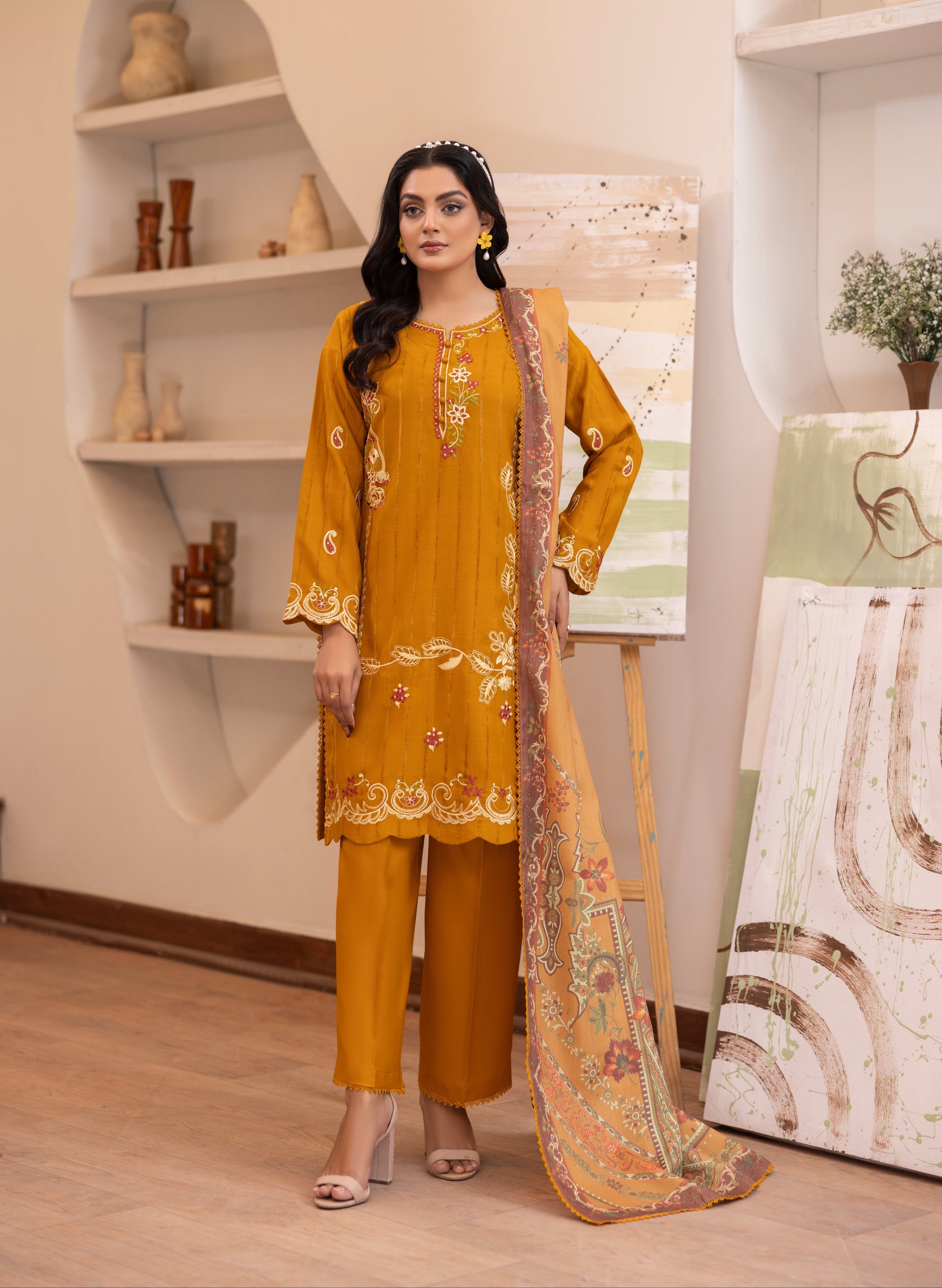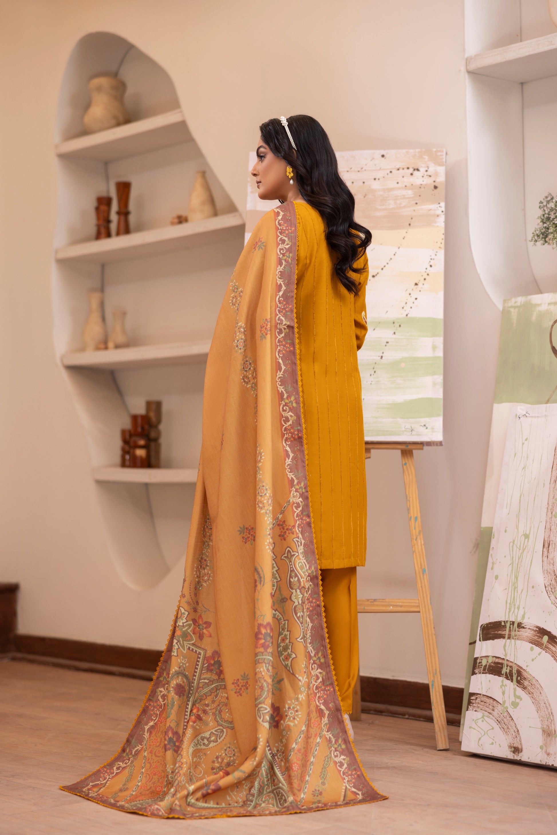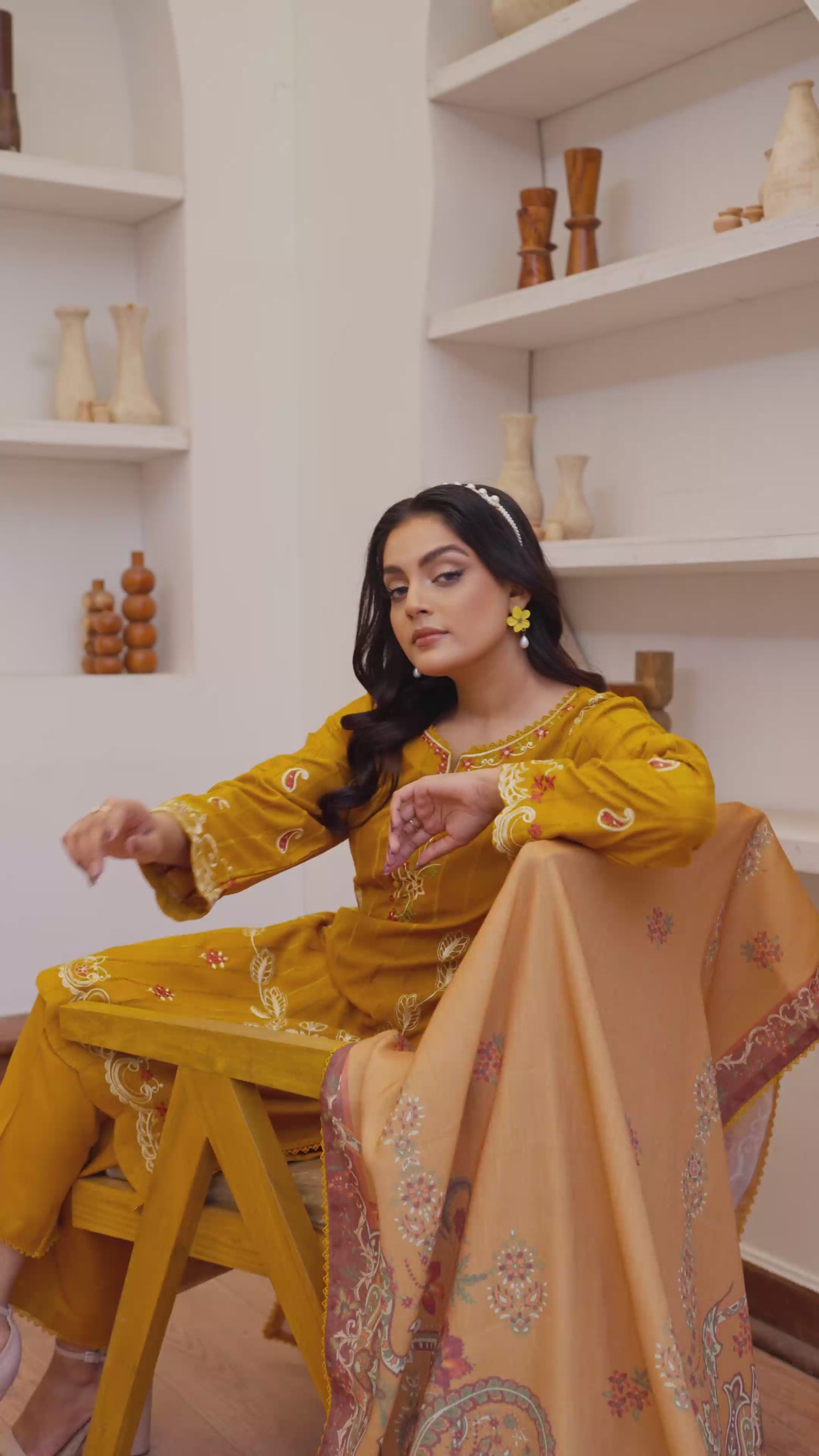 * Shawl: Complemented by a vibrant Turkish printed shawl, adding a rich cultural aesthetic to the outfit.