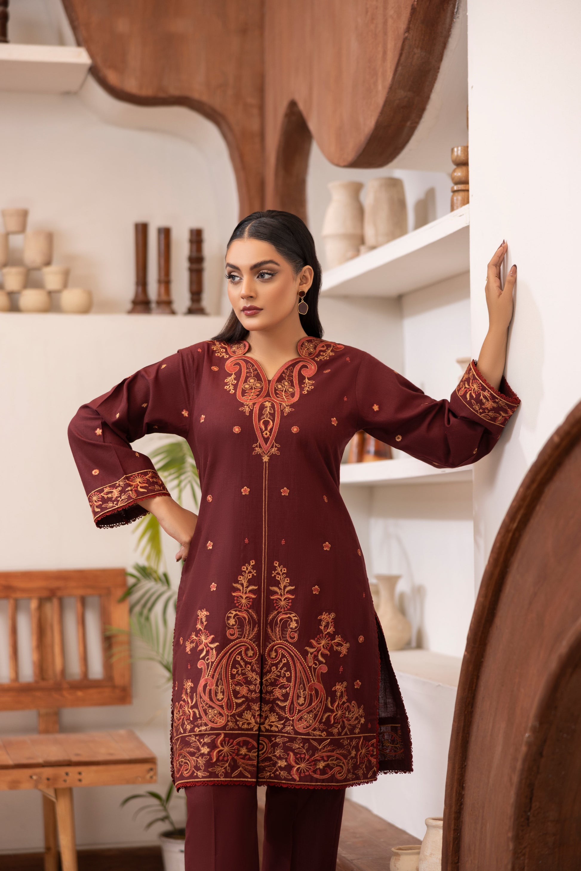 * Trouser: Paired with a plain khaddar trouser for a clean, classic silhouette.
